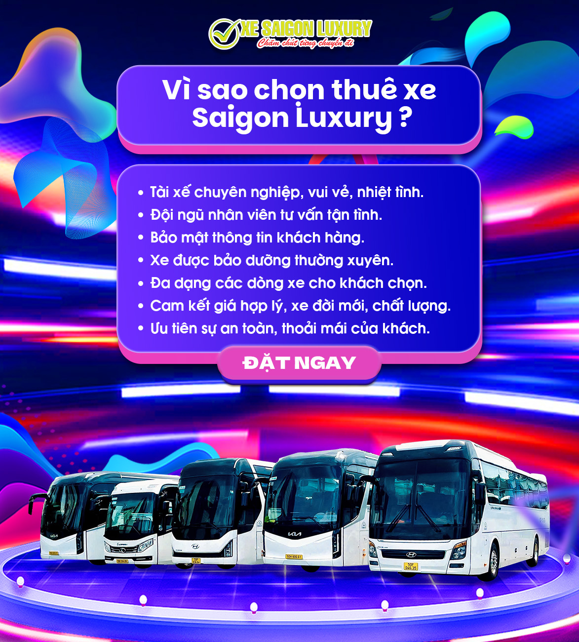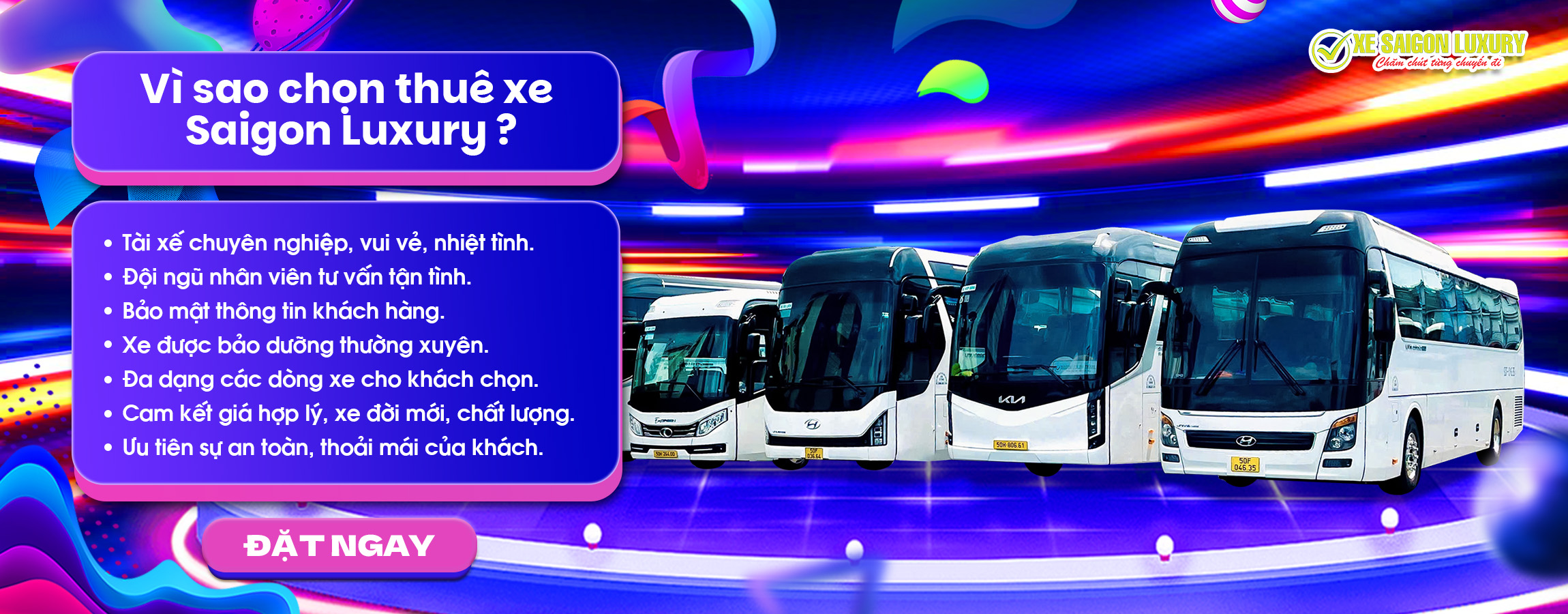 Với mong muốn phát triển trở thành top 10 Công ty vận tải lớn nhất tại Tp. Hồ Chí Minh vào năm 2030. Công ty TNHH TM DV Du Lịch Sài Gòn Luxury luôn hoàn thiện hàng ngày nhằm cung cấp đến khách hàng dịch vụ thuê xe du lịch, thuê xe họp đồng, thuê xe đi tỉnh, thuê xe hội nghị, thuê xe một chiều chuyên nghiệp, phục vụ tận tình, là lựa chọn hàng đầu của khách hàng. Liên hệ ngay Xe Saigon Luxury qua hotline 0985768688 - 0908661916 để được tư vấn tận tâm nhất.