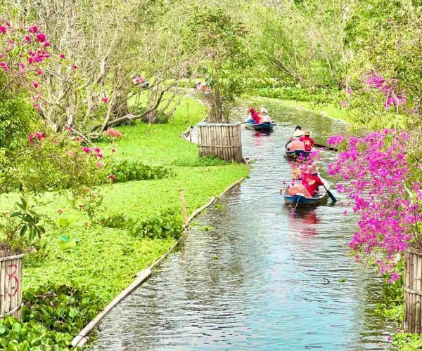Đi thuyền len lỏi qua những con rạch nhỏ, du khách sẽ được hòa mình vào thiên nhiên hoang sơ, cảm nhận bầu không khí trong lành và mát mẻ. Hai bên bờ rạch là những hàng tràm xanh mướt soi bóng xuống mặt nước phẳng lặng, tạo nên khung cảnh vô cùng thơ mộng. Trên hành trình, du khách có thể dễ dàng bắt gặp những đàn chim bay lượn trên bầu trời, tạo nên bức tranh thiên nhiên sinh động và đầy sức sống.